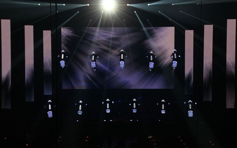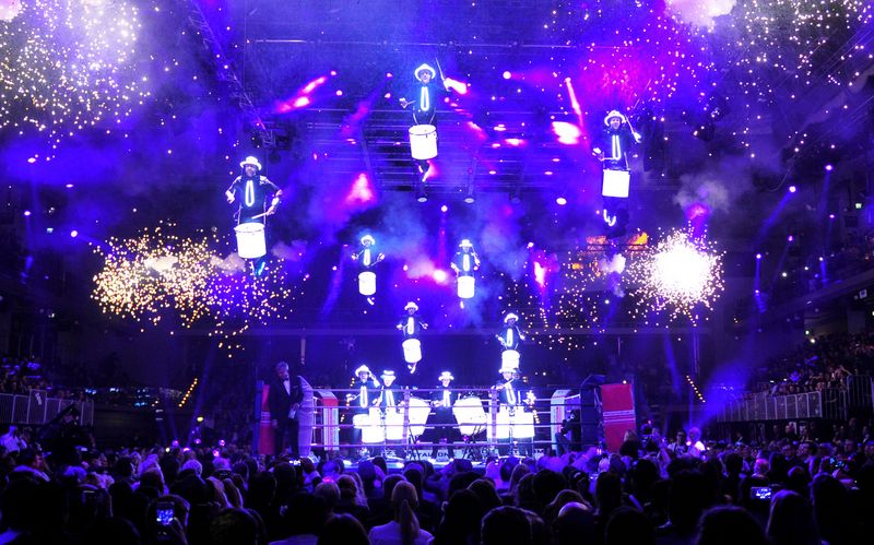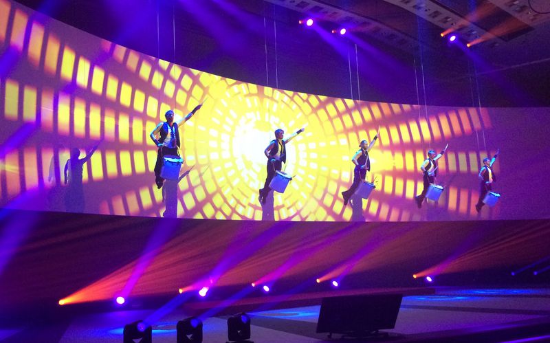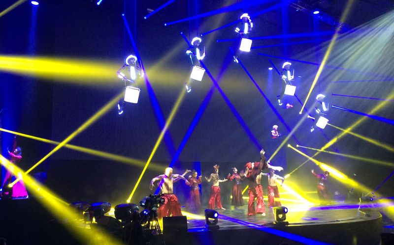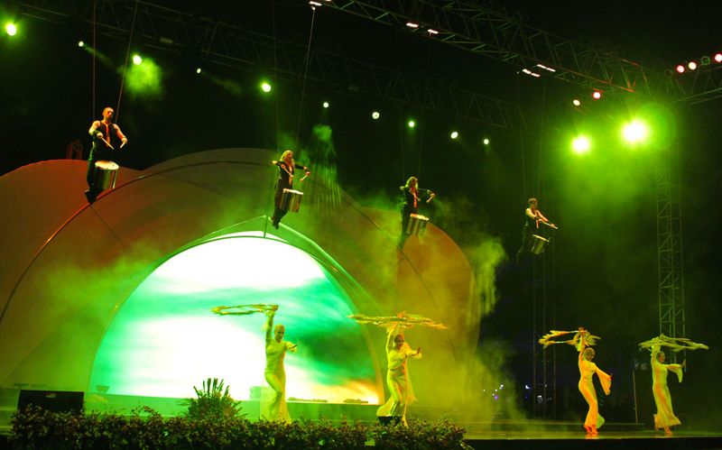 Drummers performing high above, apparently floating – baffling and at a breathtaking speed.