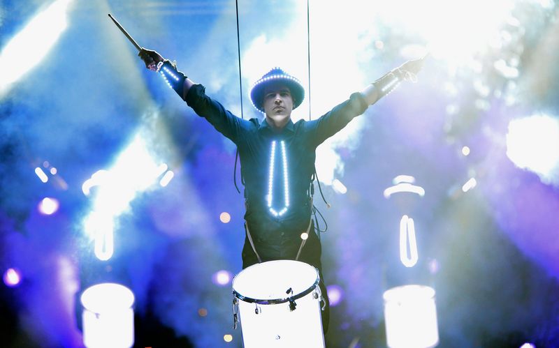Drummers performing high above, apparently floating.