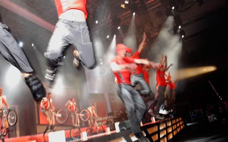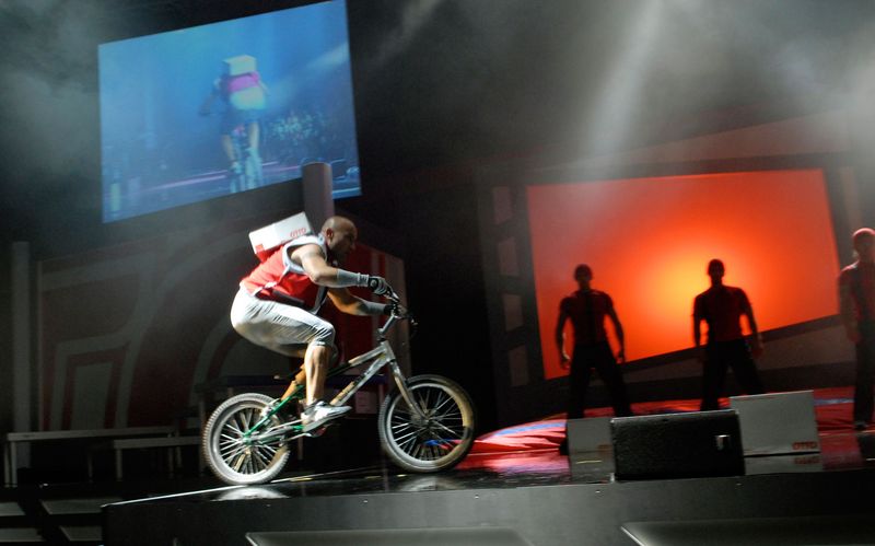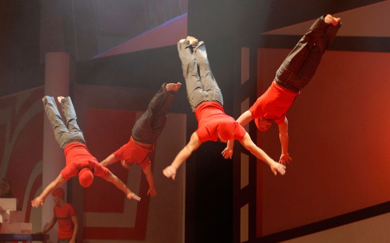 Our Trial-Bikers, Parkour Runners and Tumbling Acrobats are acting as couriers who bring more and more parcels on the stage. Showing perfect logistics the parcels are transported over an air-filled tumbling track from point A to B over the wide stage. Finally only one parcel remains left. This is being given to Mr. Werner Otto personally.