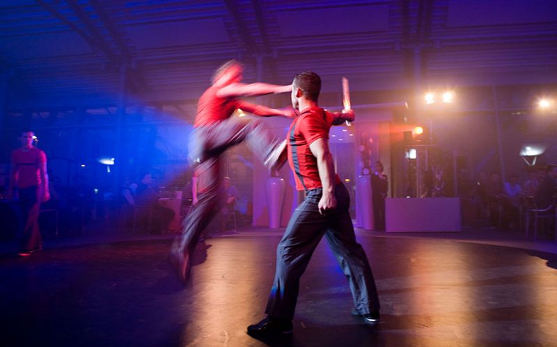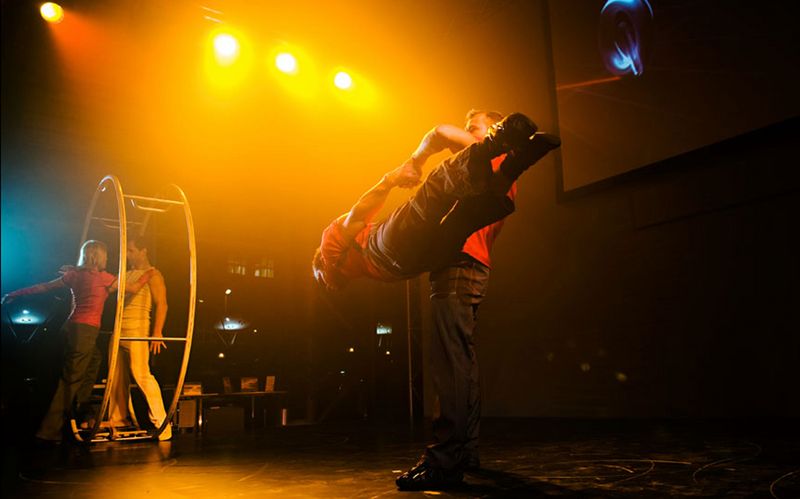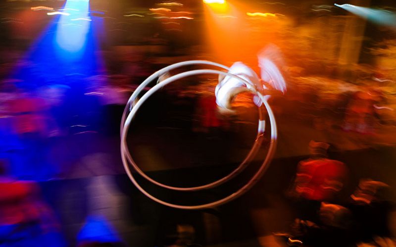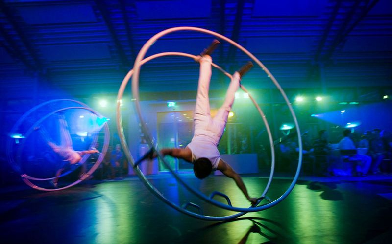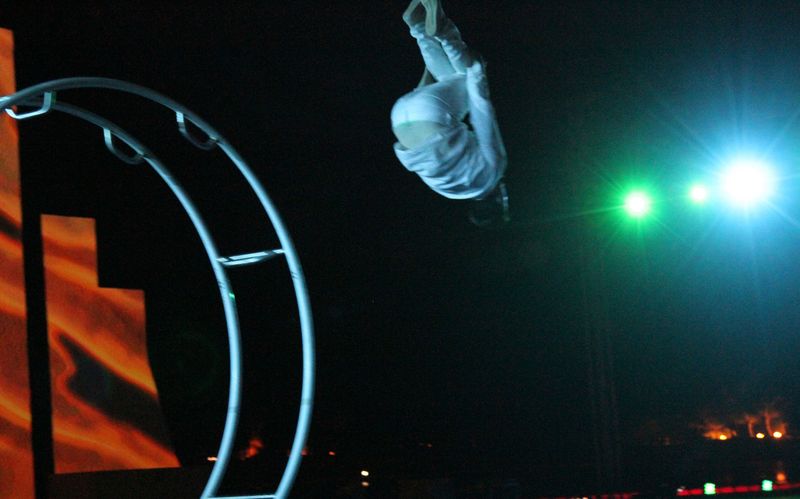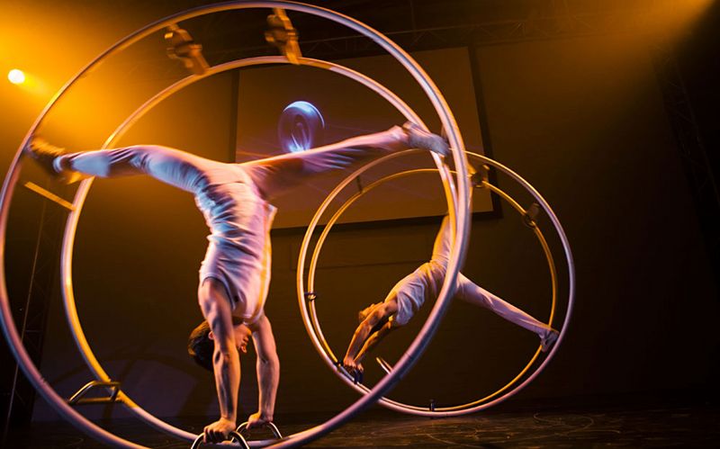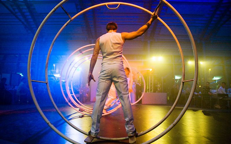 The baton change takes place in a dynamic choreography. Acrobats pass the baton to German Wheel artists. Dancers enrich the scenery with female charm. Everybody wants the desired baton, a wild chase begins, which ends in a final pose of all artists together. The whole performance is supported by impressive laser effects.