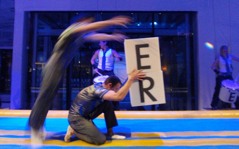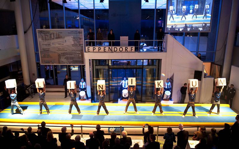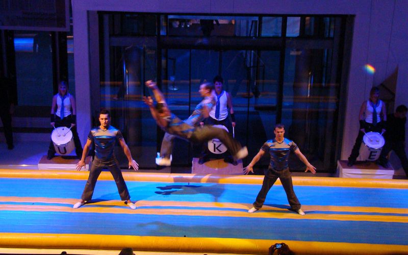Even the most modern new built clinic was erected stone by stone, although in the shortest possible time. And so the committee of the doctors liked our idea to put this in scene symbolically. Tumbling acrobats are visualising the process of the construction process with letter cubes. Cubes with single letters are tranported dynamically with flic flacs and somersaults over an air-filled tumbling track and added together cube for cube to the name of the Medical Center.