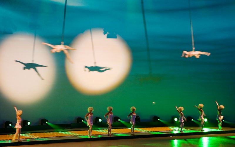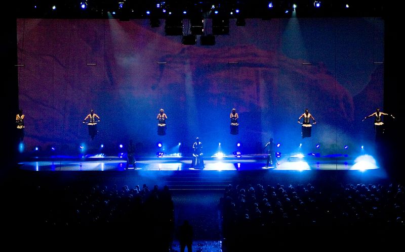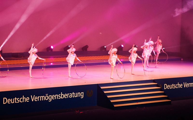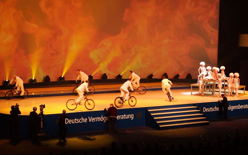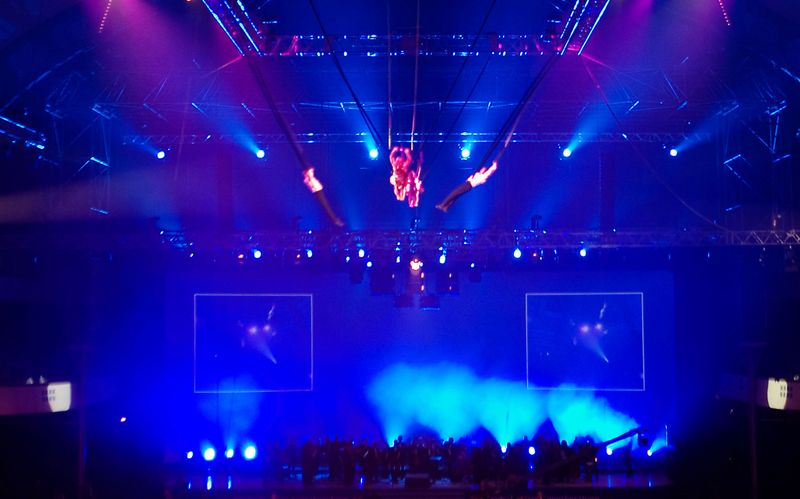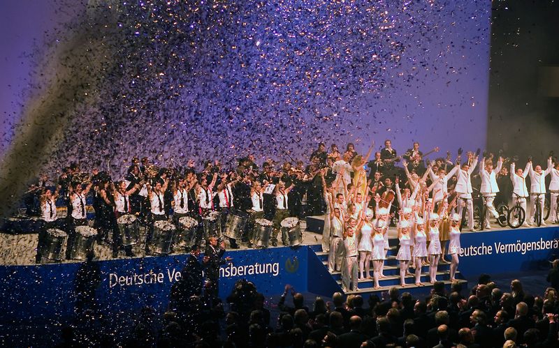 All started with a surprising and powerful opening sequence of the Flying Drummers. In the following we staged a choreography with hoops performed by top-class rhythmic gymnasts. Trial Bikers passed close to the audience to enter the stage jumping over and off stage elements. Off we go with the aerial straps of the Maree twins who appeared like weightless water beings in front of a projected water animation. Tumbling acrobats acted on an airtrack which was integrated in the stage. High above the heads of the audience Bungee Artists were flying through the dome of the Festival Hall. As a culmination a live singer sang the hymn “We are the Champions“, accompanied by an orchestra of 50 musicians. A mega-show with over 100 artists in total.