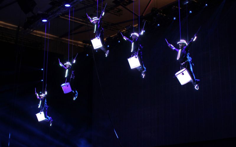Mobile World Congress is the world’s largest gathering for the mobile industry organised by the GSMA and held in the Mobile World Capital Barcelona. Producers and clients meet to discuss topics concerning the latest technologies of telecommunication. A fast and safe networking is in first place. We were booked for the gala event of the leading global and communications technology solutions provider Huawei. Together with numerous dancers our Flying Drummers showed what a perfect connection looks like. After a dynamic dance opening the Drummers surprisingly droped down at high speed from the ceiling with illuminated drums and costumes to perform in interaction with an expressive dance choreography.