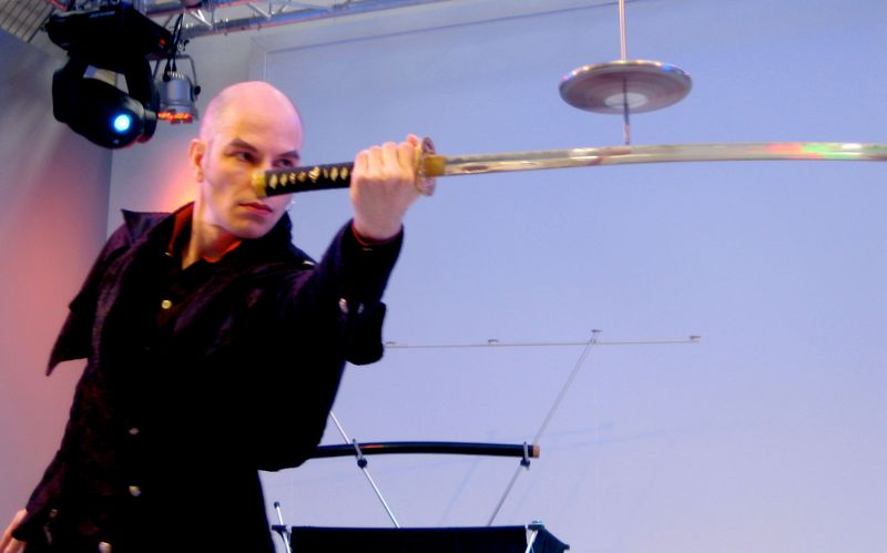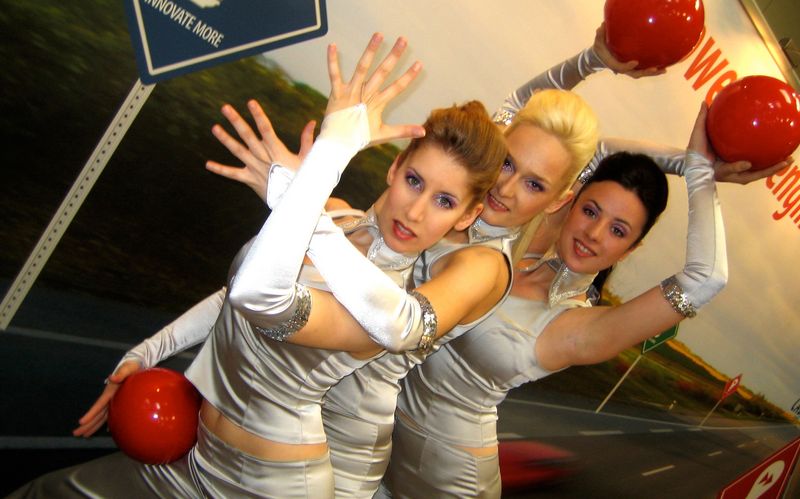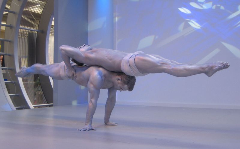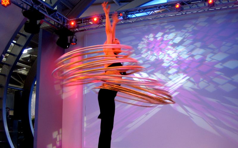 Rhythmic gymnasts are symbolising networking in a sporty choreography with ropes, demonstrate flexibility and diverse applications. The connection of the product is emphasized on a screen in the background. An edgy artist juggles and balances a great number of spinning tops – a real master of complexity. It needs precision and accuracy when he is balancing one of the spinning tops on the sheath of a sword and makes it glide to the extreme tip of the blade. Multitasking is shown by a Hula Hoop Artist who manages making more and more hoops circling around her body. Two muscular acrobats fascinate with powerful equilibristic positions symbolising strength and reliable partners. The varied performance is framed by Live-Percussion and staged in an eye-catching way.