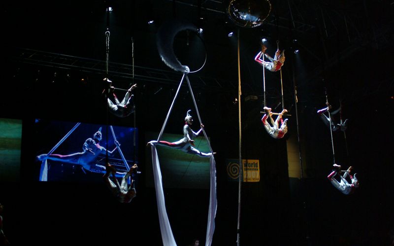 With a red thread we perform the whole creation in accordance with the title and motto “Moving Night“. Two protagonists, a man and a woman separately experience a trip through an extraordinary night. Like in a fantasy world they meet bizarre and weird figures. They are acting in varied choreographies we have worked out with the different sports groups. There were the most different performances concerning night phenomenons which are staged acrobatically and in terms of dance. From vampires to devils, fireflies and gremlins. In the end the sleepwalking protagonists meet in an encounter with the dream figures. Movement is the binding element, doing gymnastics turns to performing arts.
