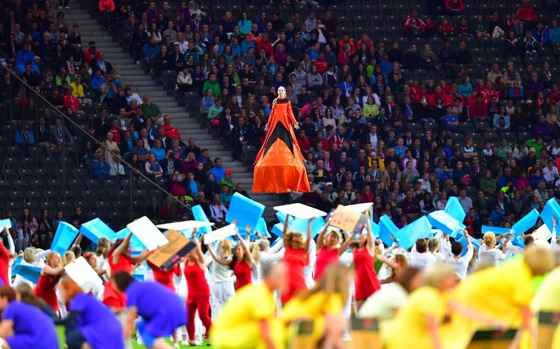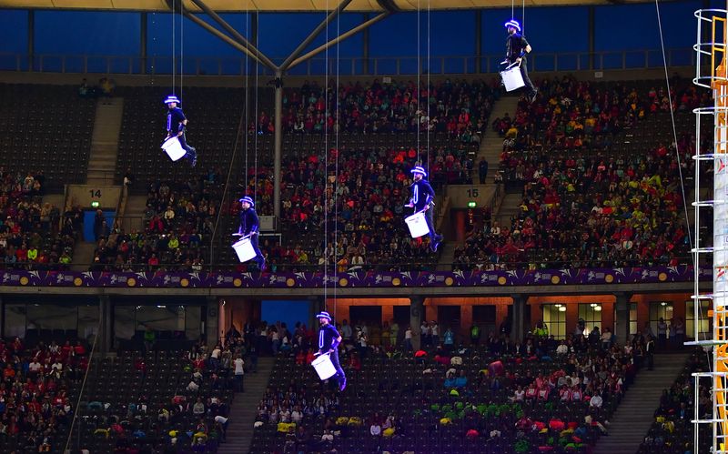 Olympic Stadium: 55.000 guests came to see the great show in the Olympic Stadium. There were about 6.000 athletes involved. SANOSTRA supported the happening with a Swinging Poles and a powerful Flying Drummers performance.