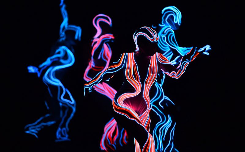 Trying to escape a world of uniformity the performers are taking you on a journey full of energy and phantasy. In a variety of shapes, figures and forms. The artists communicate in a very physical manner: By wearing masks and illuminated costumes, they emphasize and focus their body language. Each character expresses himself through the form of movement and acting.